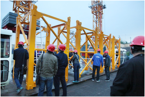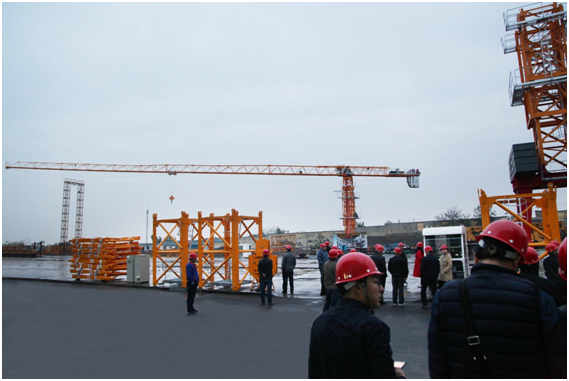 全體與會嘉賓參觀大漢股份專為裝配式建筑研發(fā)的平頭片式7025、7530塔式起重機(一)