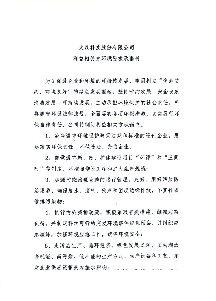 大漢科技股份有限公司利益相關(guān)方環(huán)境要求承諾書(shū)