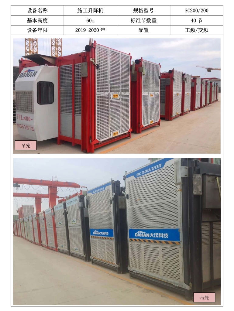 大漢科技股份有限公司發(fā)布二手施工升降機銷售咨詢信息。拍攝圖片所展示的設備為二手施工升降機產(chǎn)品,出廠日期為2019-2020年之間,含變頻、非變頻兩種型號,所有銷售設備均手續(xù)齊全、檢修保養(yǎng)完畢,以上圖片皆為實景實拍,隨時歡迎有需要的客戶咨詢考察!二手設備再利用,為您創(chuàng)造新價值!